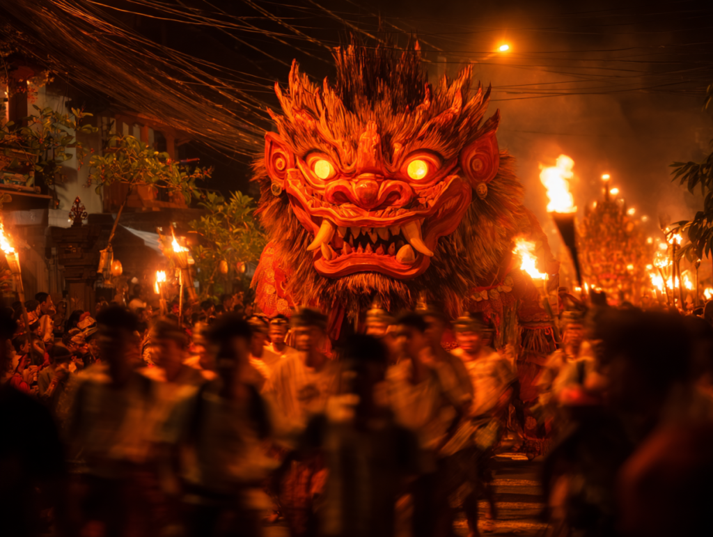 La soirée du 18 mars est également marquée par le Pengerupukan : des processions nocturnes bruyantes et festives parcourent les rues avec des torches, des bambous qu’on frappe et des cris pour chasser les mauvais esprits, avant que le silence absolu ne s’installe le lendemain à l’aube.