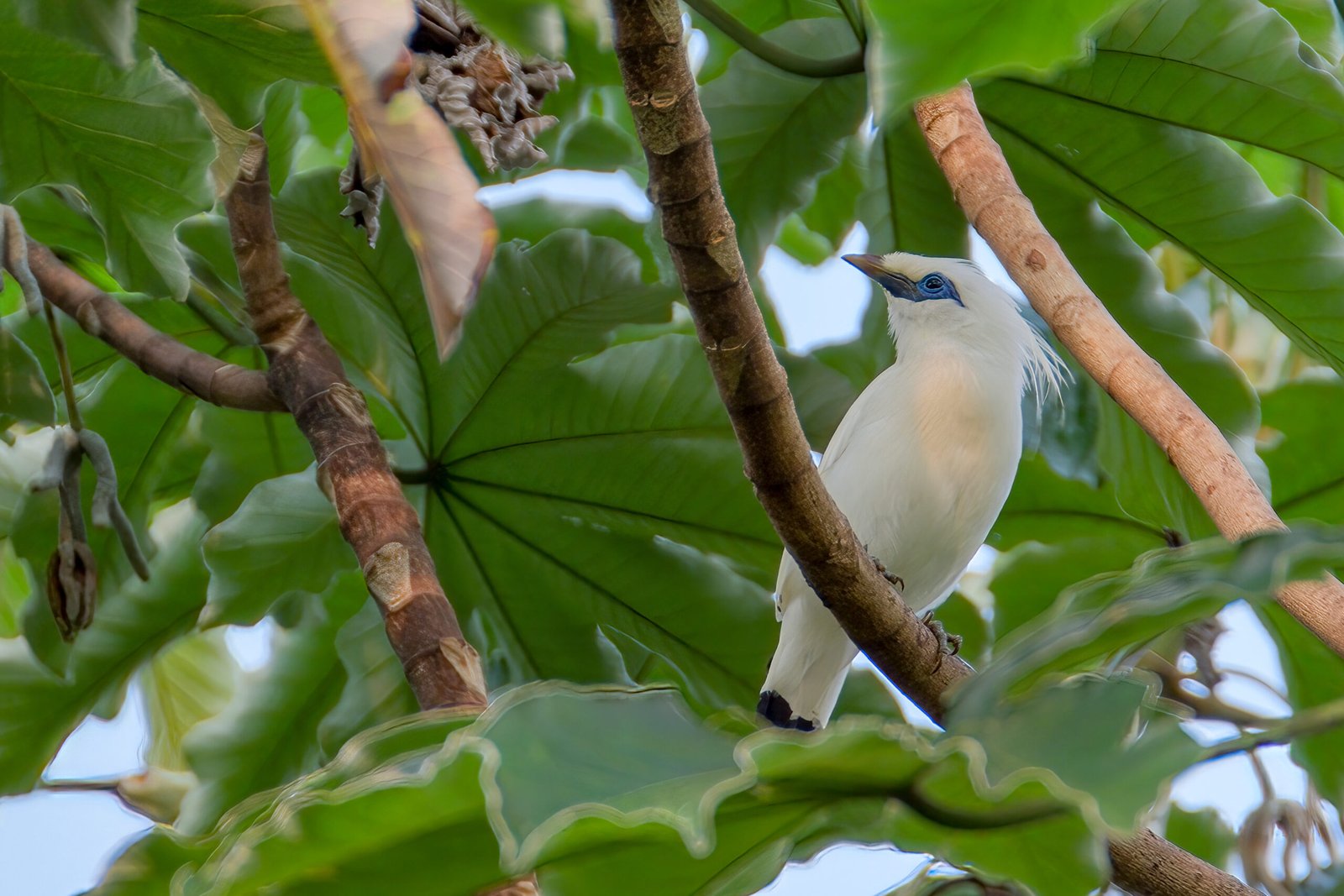 Vous pourrez reconnaître l’étourneau de Rothschild Bali à son plumage blanc éclatant, sa crête érectile distinctive, et la bande noire centrale sur sa queue. Son bec puissant incurvé avec une pointe jaunâtre et la peau bleu-cobalt autour de l’œil sont également des indices précieux pour l’identifier dans la végétation claire ou les arbres isolés de la région nord-ouest de Bali.